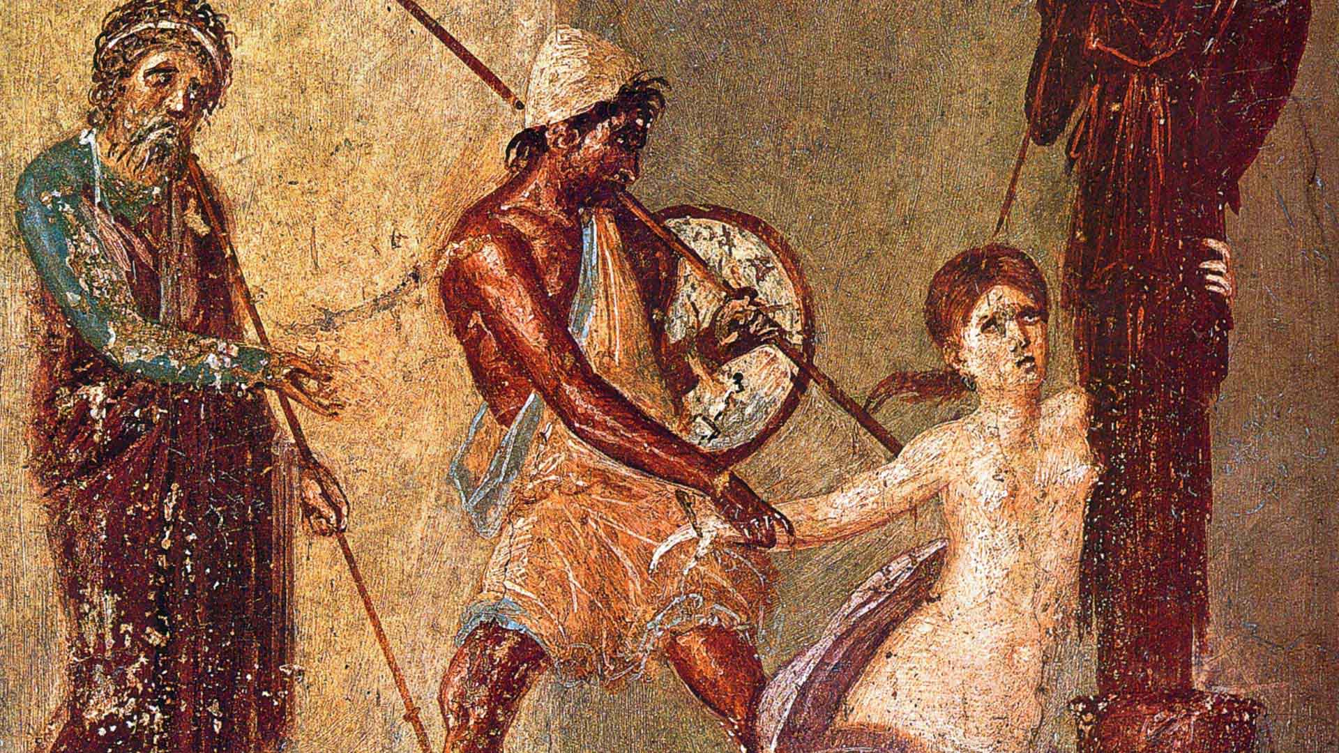 When night falls, the Greeks exit the Wooden Horse and open the gates for the rest of the army. Troy is conquered and sacked. Cassandra flees to the temple of Athena and wraps her arms around the statue of the goddess. The Lesser Ajax pulls her away from the statue, as in this articles featured image, which is a detail from a fresco at Pompeii. He rapes her on the temple floor; an event that may have already been familiar to the poet Alcaeus (ca. 600 BC), but the evidence is fragmentary. According to ancient commentators, as well as later writers like Quintus, this caused the statue to turn its eyes upward to the roof in anger. Indeed, rage at the desecration of Athena’s temple – and not any sympathy toward poor Cassandra – is the ultimate cause of the Greeks’ later troubles at sea.